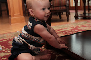 He is starting to get tired of this sitting thing, and when you set him down on the floor he arches his back because he wants you to help him stand and walk around instead.  He is really strong, and does a great job of taking steps with his little feet without much prodding.  His control is really good, he just isn't real interested in being on all fours to crawl.  He has gotten on them a few times, from a sitting position, but then he falls to his tummy and rolls to his back.